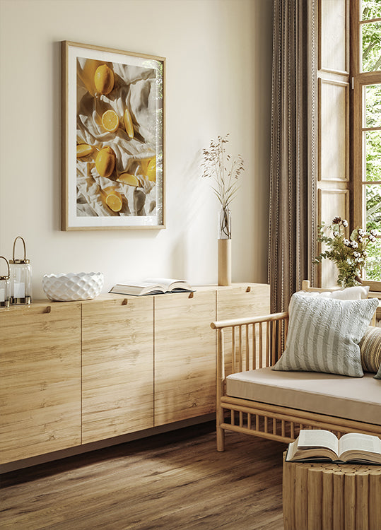 Un bodegón artístico de limones amarillos brillantes, algunos en rodajas, bellamente dispuestos sobre una tela blanca con textura. La luz del sol se filtra, proyectando sombras dinámicas que realzan el contraste entre la suave tela y las brillantes cáscaras de limón. Perfecto para crear un ambiente fresco y estimulante en la cocina o el comedor.