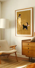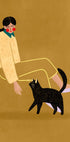 Una ilustración moderna de una mujer y su gato negro, diseñada en tonos neutros cálidos con una estética minimalista pero estilizada. Esta obra de arte irradia comodidad, comunidad y amor, perfecta para hogares con amantes de los gatos.