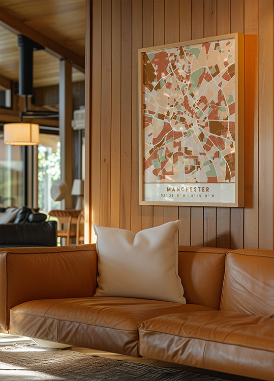 Black Maps Earth Tones 45 de Emiliano Deificus es un mapa estilizado de la ciudad de Manchester en tonos tierra apagados y negro intenso. Las líneas finas revelan calles y barrios como un patrón gráfico, donde los contrastes y las texturas crean profundidad. Un póster elegante y urbano que combina calma y energía cruda. Perfecto para el hogar y la oficina modernos.