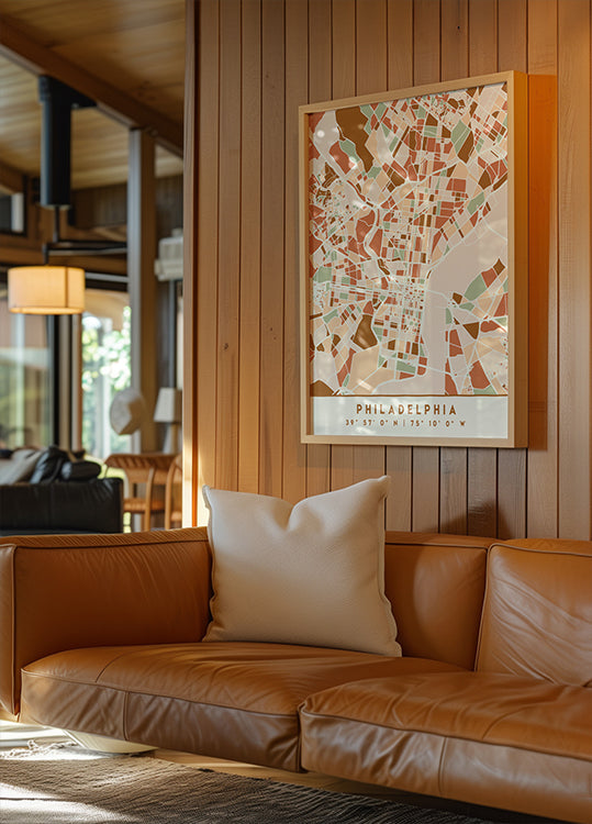 Black Maps Earth Tones 65 de Emiliano Deificus combina una cuadrícula de calles detallada de Filadelfia con tonos profundos y terrosos. Las líneas negras dibujan la vibrante estructura de la ciudad, mientras que los tonos cálidos crean un contraste tranquilo. Un póster gráfico y moderno que eleva tanto el salón como la oficina con elegancia urbana. Perfecto para una estética sencilla y nórdica.