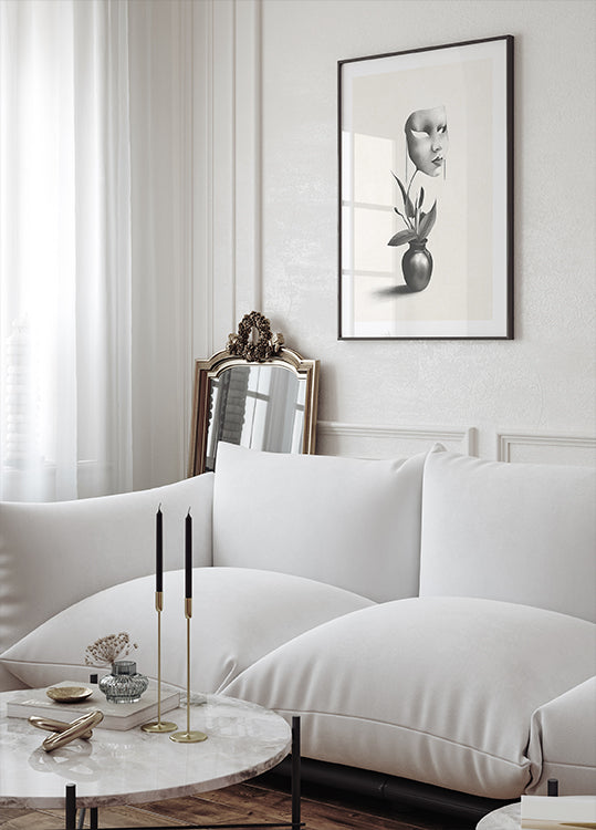Una ilustración surrealista en blanco y negro de una misteriosa máscara flotante que crece a partir del tallo de una planta en maceta. La combinación de elementos orgánicos y artificiales crea un contraste sorprendente y evoca temas como la identidad, la transformación y las emociones ocultas. Un complemento perfecto para el arte conceptual y los interiores modernos.