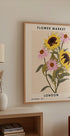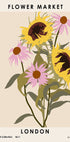 Un encantador póster floral con girasoles dorados y flores de color rosa suave. Esta obra de arte moderna de inspiración vintage celebra el esplendor floral de Londres y la animada atmósfera del verano.
