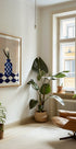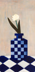 Una naturaleza muerta moderna con un distintivo jarrón a cuadros azules y una única y delicada flor. Con la combinación de patrones geométricos y minimalismo, esta pieza aporta elegancia y encanto artístico a los interiores modernos.