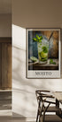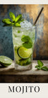Obras de arte vibrantes que representan un clásico cóctel mojito con hojas de menta, rodajas de lima y pajitas en un vaso lleno de hielo. El fondo texturizado acentúa el ambiente fresco y refrescante, perfecto para los fanáticos de la bebida y el arte de los cócteles.