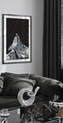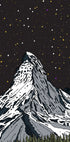 El pico de una montaña cubierta de nieve se eleva abruptamente contra un cielo nocturno profundo y lleno de estrellas. Las líneas claras y minimalistas y una composición centrada crean calma y equilibrio, mientras que los tonos azules fríos se encuentran con tonos cálidos en el horizonte. Un bosque estilizado en primer plano completa el ambiente alpino y de ensueño. Perfecto para la tranquilidad en el salón o dormitorio.