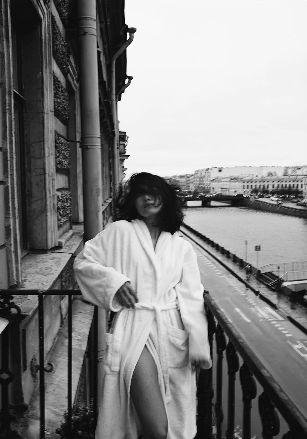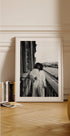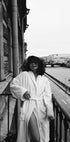 Una elegante fotografía en blanco y negro que captura la elegancia de un momento matutino en un balcón de estilo parisino. La figura en bata de baño irradia estilo e intimidad sin esfuerzo, con la ciudad y el río como fondo tranquilo. Arte de pared perfecto para los amantes de la moda, la fotografía y la estética urbana atemporal.