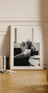 Una elegante fotografía en blanco y negro de una mujer relajándose con una toalla envuelta alrededor de su cabello mientras lee Vogue. La obra de arte captura un momento de lujosa calma y sofisticación natural, perfecto como declaración en interiores inspirados en la moda, la belleza y la elegancia moderna.