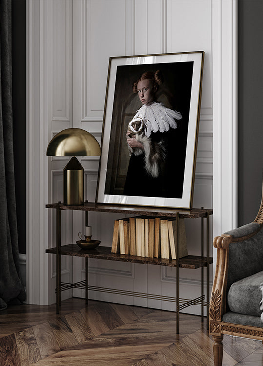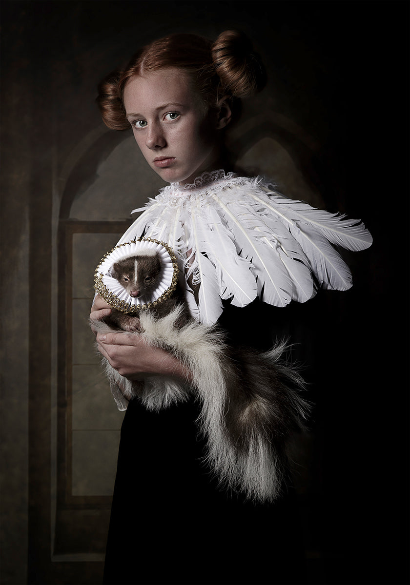 Realizado por la artista holandesa Carola Kayen-Mouthaan, este evocador retrato muestra a una joven serena con un vestido vintage con tintes medievales, cabello trenzado y cuello de plumas, compartiendo el marco con una suave mofeta. Una iluminación espectacular y nostálgica y texturas refinadas aportan elegancia del viejo mundo con un toque divertido de cuento de hadas, con ecos de retratos renacentistas.