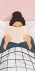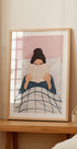 Una ilustración tranquila y acogedora de una mujer leyendo en la cama frente a una pared rosa claro. La obra irradia calma, cuidado personal y calidez, ideal para dormitorios, rincones de lectura y otros espacios relajados.