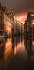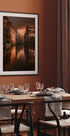 Amsterdam Evening de Luca Rebustini representa la calma del atardecer sobre los canales de la ciudad. Estrechas casas con frontones se alzan una al lado de la otra, reflejadas en el agua oscura, mientras que las cálidas ventanas y las calles adoquinadas sugieren la vida detrás de las fachadas. Un tributo atmosférico a la arquitectura atemporal de Ámsterdam. Perfecto para traer recuerdos de viajes y melancolía nórdica a la habitación.