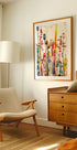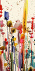 Una colorida obra de acuarela con un pájaro caprichoso rodeado de formas florales abstractas. Los colores gotean y fluyen sobre el lienzo, creando un efecto pictórico de ensueño. La obra captura la belleza lúdica de la naturaleza a través de pinceladas vivas y tonos fuertes.
