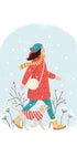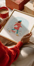 Winter Walk de Petra Holíková captura un momento tranquilo en un día nevado: una mujer con un abrigo azul y un pañuelo rojo pasea a su perro feliz mientras finos copos de nieve bailan en el aire. Los cálidos acentos rojos contra los fríos tonos azules crean una atmósfera invernal poética, llena de calma, presencia y magia cotidiana.