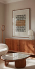 Pattern in Contrast de THE MIUUS STUDIO combina líneas estrechas, cuadrículas y rayas rítmicas con formas suaves y orgánicas. En tonos neutros de beige, negro y marrón, la composición crea una expresión gráfica tranquila con profundidad y contraste claros, ideal para una decoración minimalista, moderna y de inspiración de mediados de siglo.