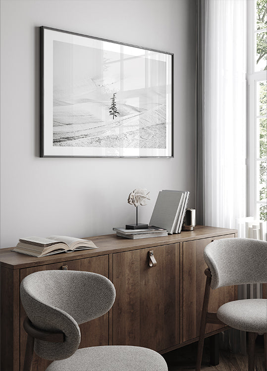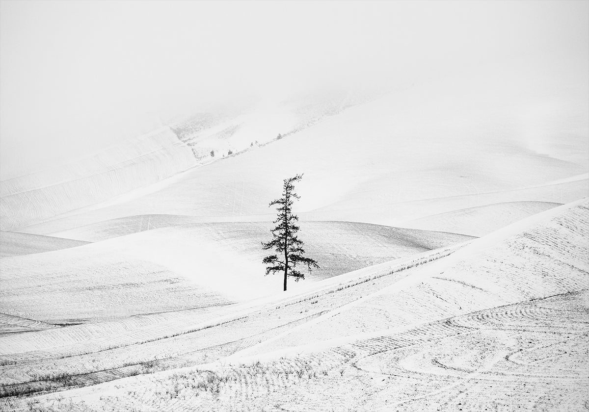 Et poetisk vinterlandskab af Vlad Sadovsky: Tågen svæver over bølgende bakker, hvor et ensomt grantræ rejser sig som et stille omdrejningspunkt. Den monokrome, højlyse stemning fremhæver frostens fine teksturer og skaber ro, eftertanke og tidløs minimalisme i dit rum. Perfekt til nordisk indretning og rolige, minimalistiske vægge.