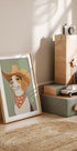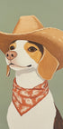Una obra de arte divertida y encantadora de un perro beagle vestido de vaquero, con un sombrero ancho y un pañuelo estampado. Este divertido retrato de animal combina el estilo rústico occidental con un humor ligero, perfecto para los amantes de los perros y las caprichosas colecciones de arte mural.