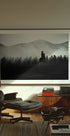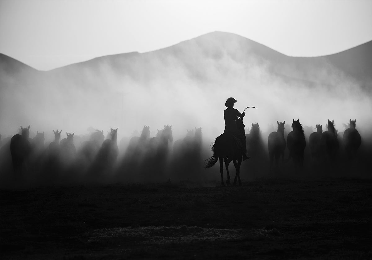 Una espectacular fotografía en blanco y negro de un vaquero cabalgando entre una manada de caballos salvajes, rodeado de niebla y polvo. Con siluetas fuertes y tonos cinematográficos, esta obra de arte captura la libertad, el movimiento y la naturaleza cruda.