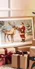 En stemningsfuld vinteraften: Julemanden glider stille gennem sneen med sine rensdyr, omgivet af fyrretræer og dalende snefnug. Det varme lys fra slæden lyser den dybblå nat op og skaber en magisk julestemning, der vækker forventning, nostalgi og hygge i ethvert rum. Granernes silhuetter indrammer scenen, mens snefnug danser.