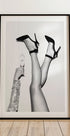 Una elegante fotografía de moda en blanco y negro que captura tacones altos, champán y elegancia divertida. El contraste minimalista crea una atrevida atmósfera de fiesta, perfecta para interiores modernos y arte mural inspirado en la moda.