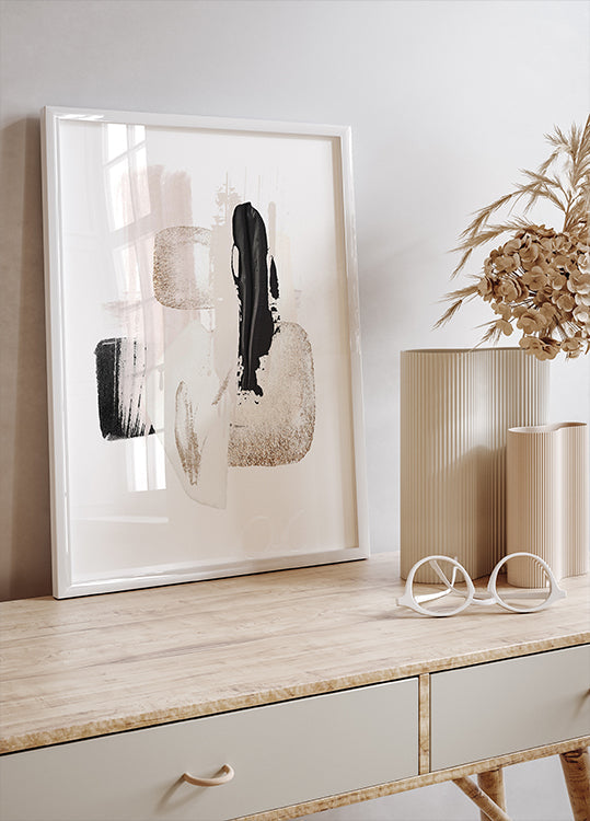 Un elegante póster abstracto con pinceladas texturizadas en colores negro, beige y dorado. La composición moderna combina texturas pictóricas con elegancia minimalista, perfecta para interiores modernos y amantes del arte.