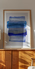 Un relajante póster abstracto con pinceladas horizontales en capas en tonos de azul y gris sobre un fondo blanco puro. La textura pictórica y las transiciones suaves crean una sensación de calma y profundidad, perfecta para interiores modernos, decoración escandinava o paredes de galería minimalistas.