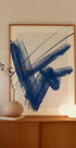 Un póster de arte abstracto moderno con fuertes pinceladas azules sobre un fondo claro. Los trazos dinámicos crean movimiento y textura, lo que la convierte en una obra sorprendentemente minimalista, perfecta para interiores modernos.