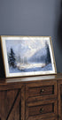 Un paisaje de ensueño cubierto de nieve se despliega en suaves pinceladas: pinos tranquilos, campos blancos y un cielo en fríos tonos azules donde bailan ligeros copos de nieve. Un toque de luz dorada del atardecer crea profundidad y calidez. El motivo desprende calma invernal, poesía nórdica y un sutil ambiente navideño, perfecto para habitaciones acogedoras.