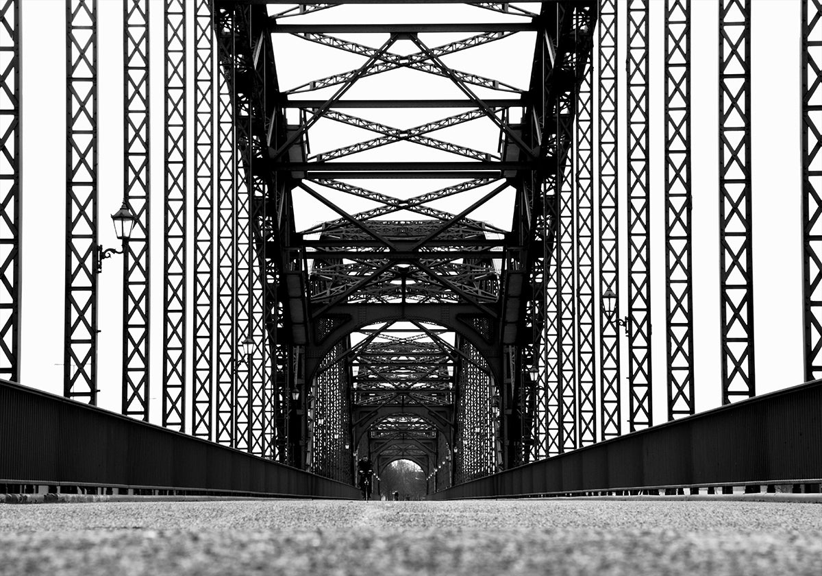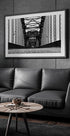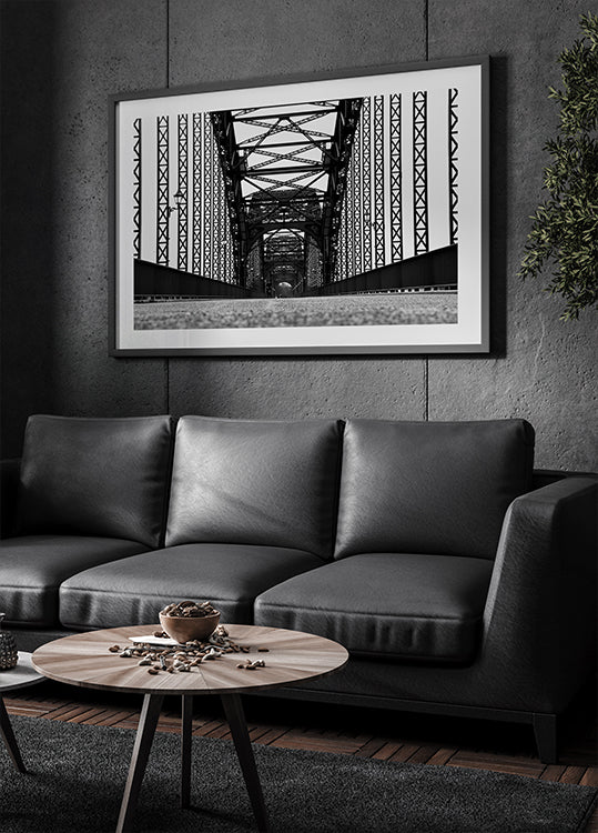 Esta sorprendente fotografía en blanco y negro captura la fuerte geometría de una estructura de acero en Hamburgo. Los patrones de hierro repetidos, los contrastes nítidos y la perspectiva profunda crean una obra de arte arquitectónica audaz que combina la belleza industrial con un diseño atemporal, perfecta para una pared con cuadros modernos y gráficos.