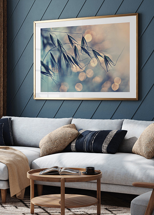 Este tranquilo primer plano captura delicadas briznas de hierba sobre un fondo pastel de ensueño con una suave luz bokeh. La atmósfera pacífica y la frágil elegancia crean una relajante obra de arte que irradia armonía, silencio y calma, perfecta para una pared con cuadros relajantes.