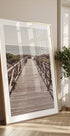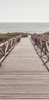 Una serena fotografía costera que muestra un paseo marítimo de madera que conduce directamente al mar resplandeciente. La perspectiva del punto de fuga invita al espectador a caminar hacia el horizonte y evoca sensaciones de calma, libertad y quietud del verano.