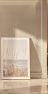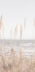Una suave fotografía costera con pajitas altas balanceándose en la costa con el océano de fondo. Los tonos beige naturales y el horizonte tranquilo crean una atmósfera relajante, ideal para interiores tranquilos inspirados en la naturaleza.