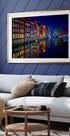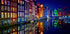 Una brillante vista nocturna de las icónicas casas de los canales de Ámsterdam, donde las coloridas fachadas brillan con la luz y se reflejan perfectamente en el agua tranquila. Este animado paisaje urbano celebra la arquitectura holandesa, el encanto urbano y los reflejos mágicos que hacen que Ámsterdam sea inolvidable al anochecer.