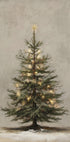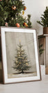 Un árbol de Navidad de estilo vintage suavemente pintado se alza bajo una tranquila luz invernal con pequeñas luces doradas entre las ramas de color verde intenso. El fondo neutro y texturizado y un ligero toque de nieve le dan al motivo una atmósfera navideña tranquila y nostálgica, perfecta para acogedoras decoraciones de temporada, paredes de galerías clásicas o hogares escandinavos.