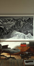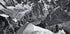Una impresionante fotografía en blanco y negro de un montañero de pie sobre una estrecha cresta nevada en los Alpes franceses. La espectacular vista captura picos escarpados, valles profundos y glaciares que se extienden hasta el horizonte. Un fuerte homenaje a la aventura, la resistencia y la belleza de los paisajes alpinos.