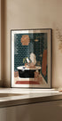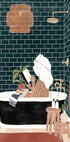 Una acogedora ilustración de una mujer que se relaja en una bañera y lee un libro con una toalla alrededor de la cabeza. Rodeada de modernos accesorios de baño, cálidos tonos tierra y un toque de vegetación, la obra irradia calma y desenfreno. Perfecto para crear un ambiente relajante en el hogar.