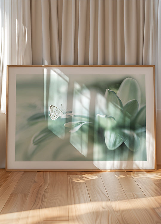 Una excelente fotografía macro de una mariposa descansando suavemente junto a una brillante gota de agua sobre suaves pétalos verdes. Con colores pastel y un fondo borroso de ensueño, esta obra de arte captura la fragilidad, la pureza y la tranquila belleza de la naturaleza.