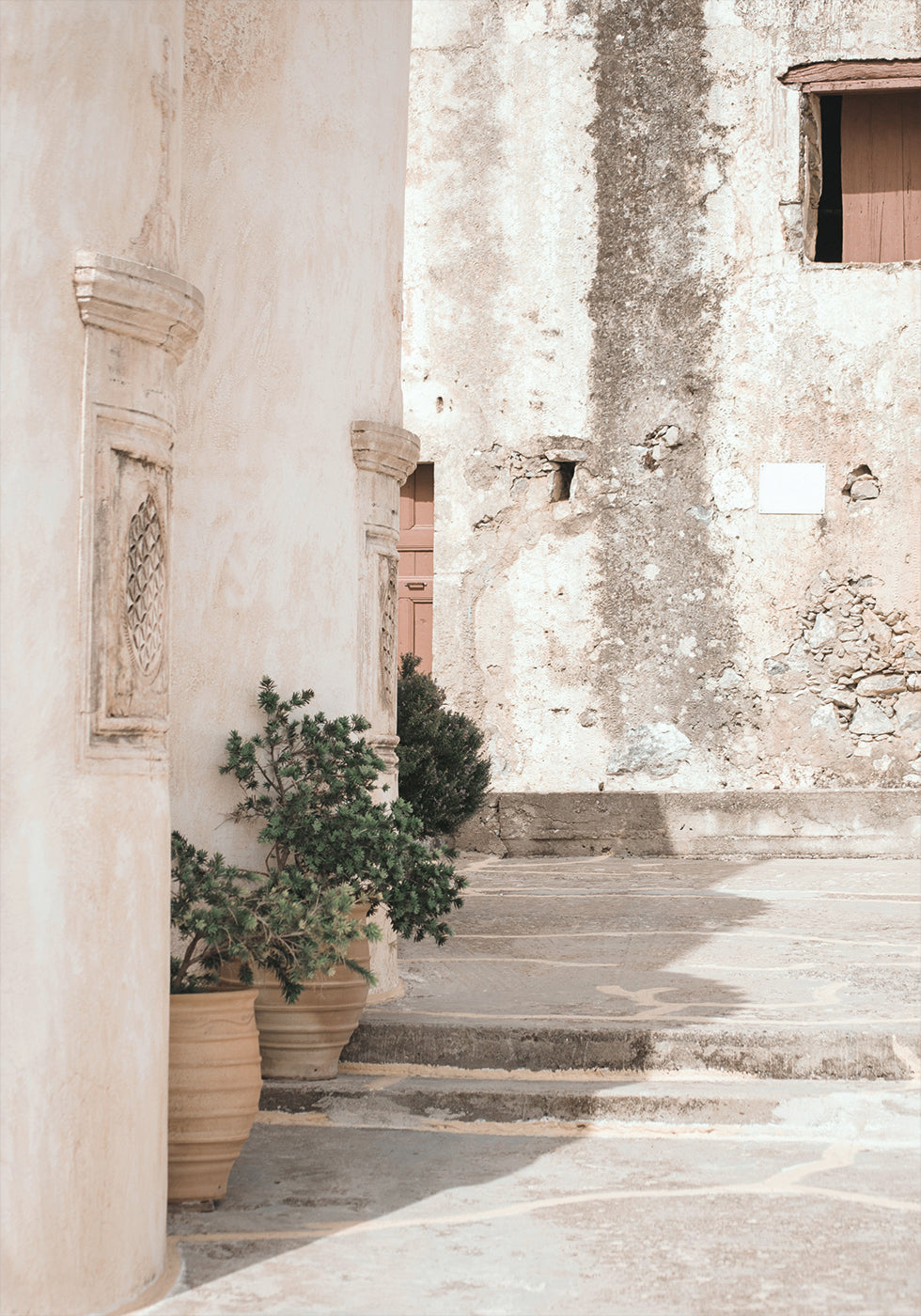 Un motivo sereno de un rincón rústico en una calle mediterránea con paredes envejecidas, plantas en macetas y una suave luz del sol. Esta obra de arte captura el encanto atemporal de la arquitectura mediterránea y la belleza de la simplicidad, perfecta para crear una atmósfera relajante.