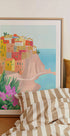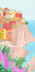 Una encantadora ilustración inspirada en acuarela de Cinque Terre, Italia. Casas de colores pastel sobre las rocas con vistas al mar azul, rodeadas de exuberantes plantas y flores. Un motivo perfecto para viajeros y decoración costera.