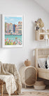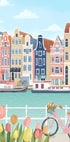 Una colorida y encantadora ilustración de la ciudad de Ámsterdam con sus icónicas casas en los canales, bicicletas, tulipanes y barcos. La obra de arte captura la esencia de la cultura holandesa, con fachadas vibrantes, canales tranquilos y una atmósfera urbana romántica. Perfecto para viajeros y aquellos inspirados por el encanto europeo.