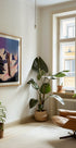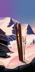 Un póster de esquí de inspiración retro en suaves tonos pastel: la puesta de sol pinta el cielo, mientras los picos nevados se elevan sobre una amplia ladera alpina. Un esquiador estilizado con bastones abre un camino a través del blanco, invitando a la atmósfera de esquí europea, la aventura y la calma invernal. Ilustración de Nicolás. Perfecto para esquiar todo el año.
