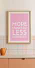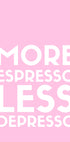 Un póster tipográfico divertido y minimalista con texto blanco sobre un fondo rosa suave. La divertida cita "More Espresso Less Depresso" aporta humor y motivación, perfecta para los amantes del café y la decoración moderna del hogar. Una declaración divertida para cocinas, cafeterías u oficinas.