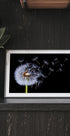 Un hermoso primer plano de un diente de león liberando sus semillas al aire sobre un fondo oscuro. La pelusa flotante simboliza la libertad, la fragilidad y la belleza fugaz, lo que hace de esta obra de arte una elección poética para cualquier decoración.