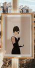 Una ilustración minimalista y elegante de una mujer con un vestido negro clásico, inspirada en la moda y la elegancia atemporales. la cita “La elegancia es la única belleza que nunca se desvanece” agrega sofisticación, lo que hace que esta obra de arte sea perfecta para los amantes de la moda, hogares elegantes y decoración de paredes moderna.