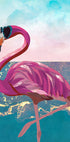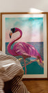 Un póster artístico divertido y colorido que muestra un flamenco rosa con elegantes gafas de sol en forma de corazón junto al mar. Con fuertes tonos de rosa, azul y magenta, esta ilustración tropical irradia vibraciones navideñas y diversión veraniega, perfecta para los amantes de la playa.