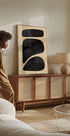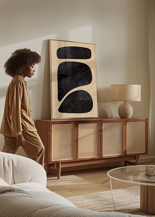 Una elegante obra de arte abstracta con tres llamativas formas negras apiladas sobre un cálido fondo beige. La composición minimalista y la superficie texturizada añaden un toque moderno y sofisticado, perfecto para paredes de galería, salas de estar o interiores de inspiración escandinava.