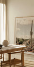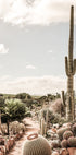 Un paisaje sereno inspirado en el desierto de altos cactus y exuberantes suculentas bajo un cielo suave y nublado. Esta fotografía botánica captura la tranquila belleza de una granja de cactus, con texturas naturales, tonos tierra y una calma eterna. Una impresión perfecta para los amantes de la naturaleza y las plantas.