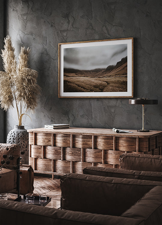 Un paisaje espectacular en las Islas Feroe, con imponentes colinas y un vasto valle de hierba bajo un denso manto de nubes bajas. Los tonos apagados y la belleza natural evocan una sensación de aislamiento y naturaleza virgen, ideal para temas como la majestuosidad de la naturaleza y la tranquilidad distante.