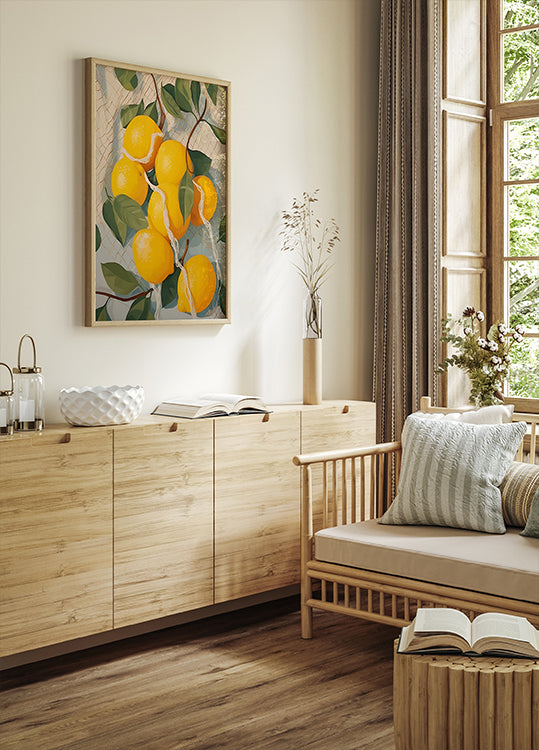 Una colorida ilustración de limones amarillos maduros entrelazados en una suave red de hojas verdes. Un motivo veraniego y mediterráneo, ideal para la cocina o rincones acogedores.