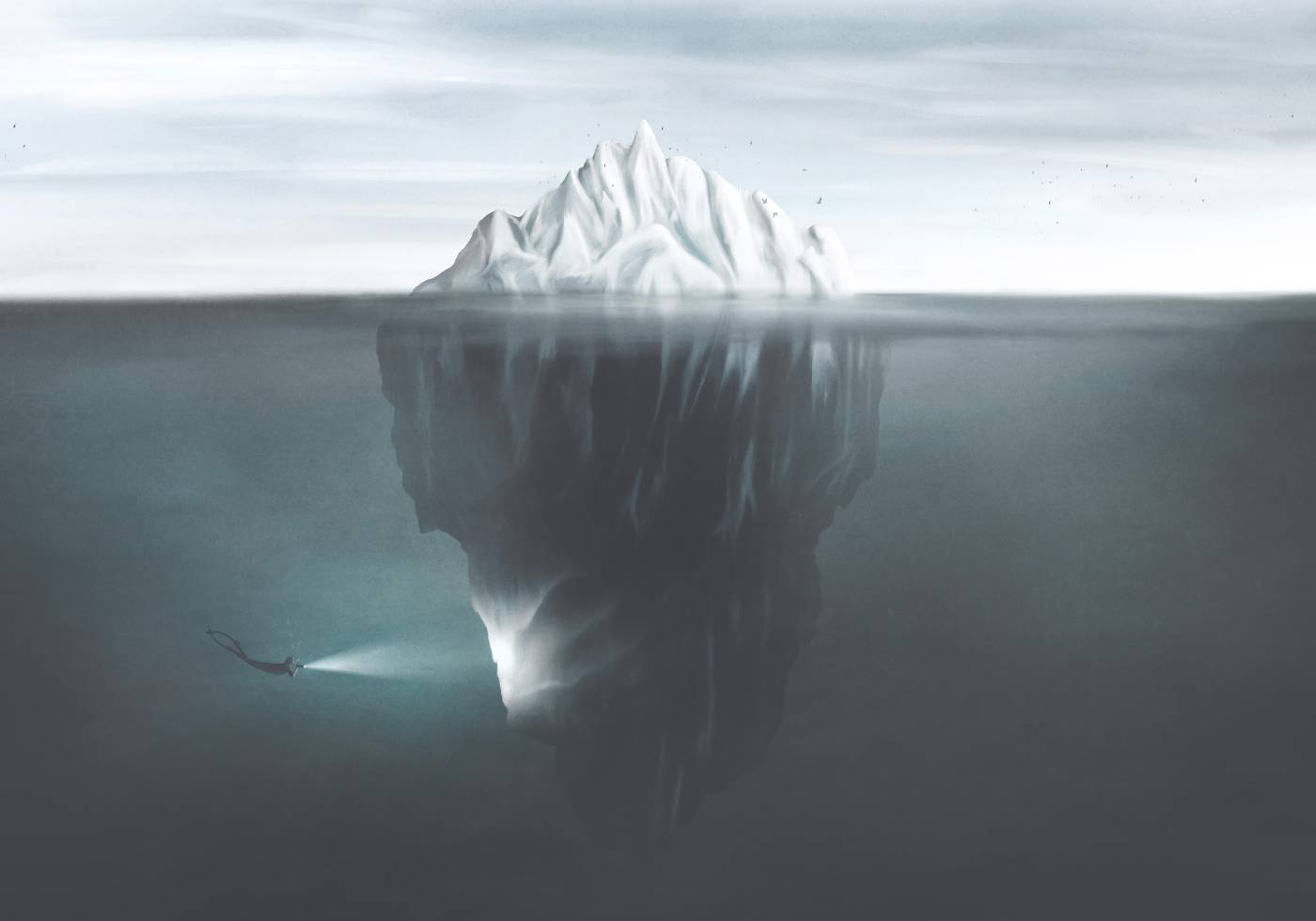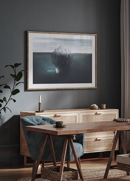 Una obra de arte que invita a la reflexión que representa un iceberg con una profundidad oculta bajo la superficie del agua, donde un buceador solitario explora el océano. El motivo simboliza el potencial oculto, el esfuerzo invisible y la profundidad del conocimiento que a menudo se pasa por alto. Perfecto para oficinas, estudios creativos o entornos inspiradores como recordatorio visual de lo que se esconde tras el éxito.