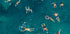 Una colorida vista aérea de personas nadando y flotando en aguas cristalinas de color turquesa. Esta animada escena veraniega captura la alegría del ocio, la libertad y el refrigerio bajo el sol. Perfecto para evocar un ambiente de vacaciones y relajación costera.