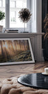 Póster Niebla en el bosque con musgo blanco en primer plano